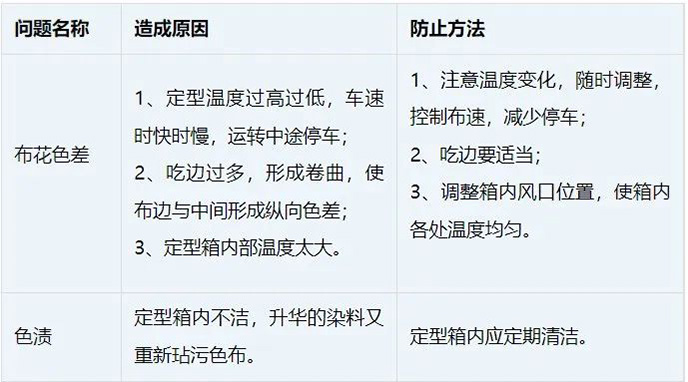 如果熱定形溫度過低,時間過短均能造成織物表面不平整、不挺括、門幅收縮等疵病,失去定形作用;如定形溫度過高或時間過長,會造成織物發硬變脆,強力下降,彈性降低并能使某些分散染料升華而產生色差,嚴重的甚至能使纖維熔融。