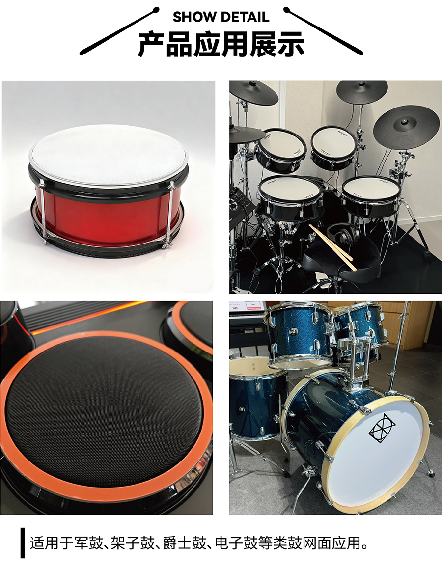 鼓皮絲網是覆蓋于鼓皮表面或鼓腔外側的防護與聲學輔助配件,主要采用尼龍、聚酯或特殊化纖材質經精密編織制成,核心定位是 “保護鼓皮 + 優化聲學表現”,尤其以硬挺質感為核心優勢,適配架子鼓、非洲鼓、手鼓等多種鼓類樂器。